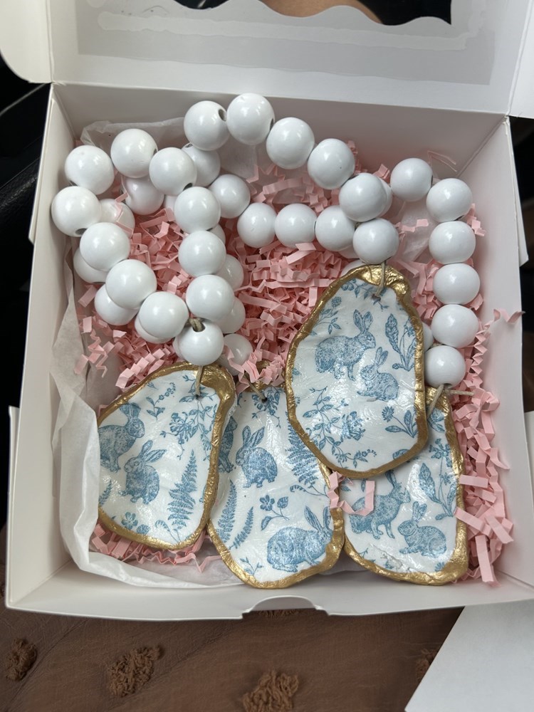 Add a touch of coastal charm to your table with this handcrafted set of four beaded oyster shell napkin rings, beautifully designed for Easter or spring gatherings. Paired with a coordinating trinket dish, this unique set blends artistry and function—perfect for entertaining or gifting.